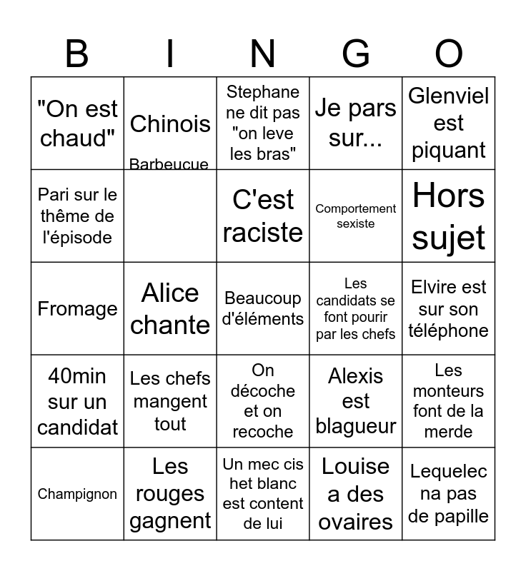 This bingo card has 90 words: Dylan est insuportable, C'est qui lui ?, On décoche et on recoche, Allusion à la guerre, Remarque sexiste, Allusion sexuelle, Léa est fille de marin pêcheur, On voit les coulisses, Un.e candidat.e parle de sa famille, Un.e candidat.e est stressée, Beaucoup de travail, Xavier lève les mains, Cette année finit les brigades, Elvire est sur son téléphone, Un.e candidat.e cuisine son terroir, C'est raciste, Compliment sur l'assiette choisie, Cuisson ratée, Antoine est favori, Un.e candidat.e ne finit pas son plat comme iel aurait voulu, Végétarien, Un.e candidat.e n'est pas compris.e par les chefs, Un mec cis het blanc est content de lui, "Beau goss", Fromage, Les rouges gagnent, Les beiges gagnent, Coup de coeur, Laser, Percutant, Xavier perd sa grille, Les monteurs font de la merde, Desat partielle, 40min sur un candidat, "On est chaud", Je pars sur..., Stephane ne dit pas "on leve les bras", Stephane parle d'un candidat a 100min de la scene, Alice chante, Hors sujet, Champignon, Pari sur le thême de l'épisode, Kick/Twist, Rungis voulait destock un produit (tout le monde le cuisine alors que c'est pas obligatoire), Citron caviar, Alexis est blagueur, Les gris gagnent, Déja les pubs, Expression insolite, M6 sous titre, Cuisine avec amour, Comportement sexiste, Antoine est problématique, Citation kaamelot, "Dernière minute", Une candidate se laisse marcher sur les pieds, Les candidats se font pourir par les chefs, Végétal, Degust : compliments sur le plat, Le gout le gout le gout, Balle perdue, Antoine ne se remet pas en question, Léa met une touche iodée, Dylan le shark, Terre mer, Main de Bouddha, Victor est technique, Louise a des ovaires, Un candidat n'a jamais fait ça, Bamos, Les chefs mangent tout, Beaucoup d'éléments, Jeu de mots pourri, Mandoline, Chinois, Barbeucue, Ramener de la fraicheur, Emporte pièce, Jeu de texture, Un chef chante, Lequelec na pas de papille, Glenviel est piquant, Chef paul peret, Paul peret defend le candidat, La prod sauve un candidat, Nicolas est conc, La cameran est un journaliste, La caméran parle avec les candidats, Elvire est misandre and Un chef conseille un candidat endehors de la degust.