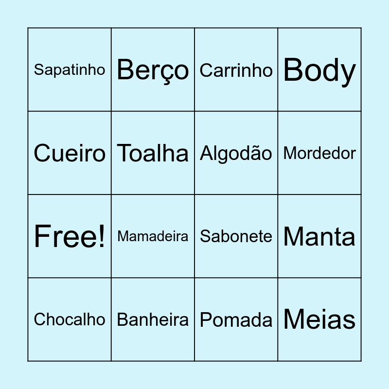 This bingo card has 25 words: Free!, Fralda, Mamadeira, Chupeta, Body, Sapatinho, Berço, Carrinho, Manta, Chocalho, Banheira, Sabonete, Talco, Babador, Toalha, Macacão, Meias, Cueiro, Móbile, Pomada, Mordedor, Touca, Naninha, Algodão and Termômetro.