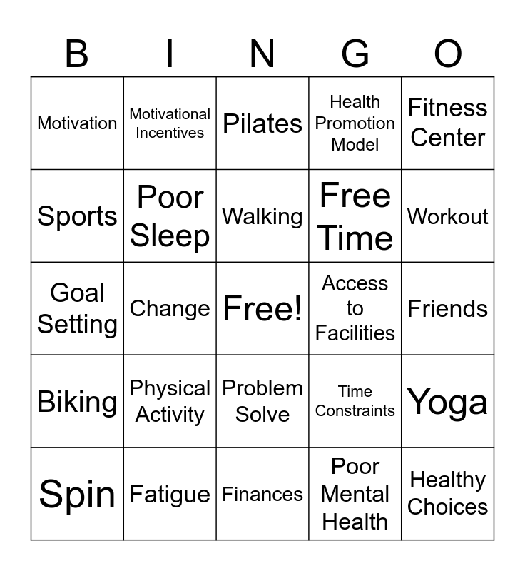 This bingo card has a free space and 44 words: Healthy People 2030, Physical Activity, Chronic Disease, Poor Mental Health, Obesity, Decreased Academic Performance, Poor Sleep, Physical Discomfort, Health Promotion Model, Healthy Choices, Motivation, Fatigue, Time Constraints, Friends, Social Support, Insecurity, Finances, Access to Facilities, Transportation, Goal Setting, Motivational Incentives, Problem Solve, Campus Resources, Fitness Center, Group Classes, Trails, Walking, Running, Yoga, Spin, Zumba, Pilates, Kickbox, Online Exercise Videos, Biking, Diabetes, Healthy Eating, Hydration, Workout, Sports, Change, Barriers, Free Time and Exercise.
