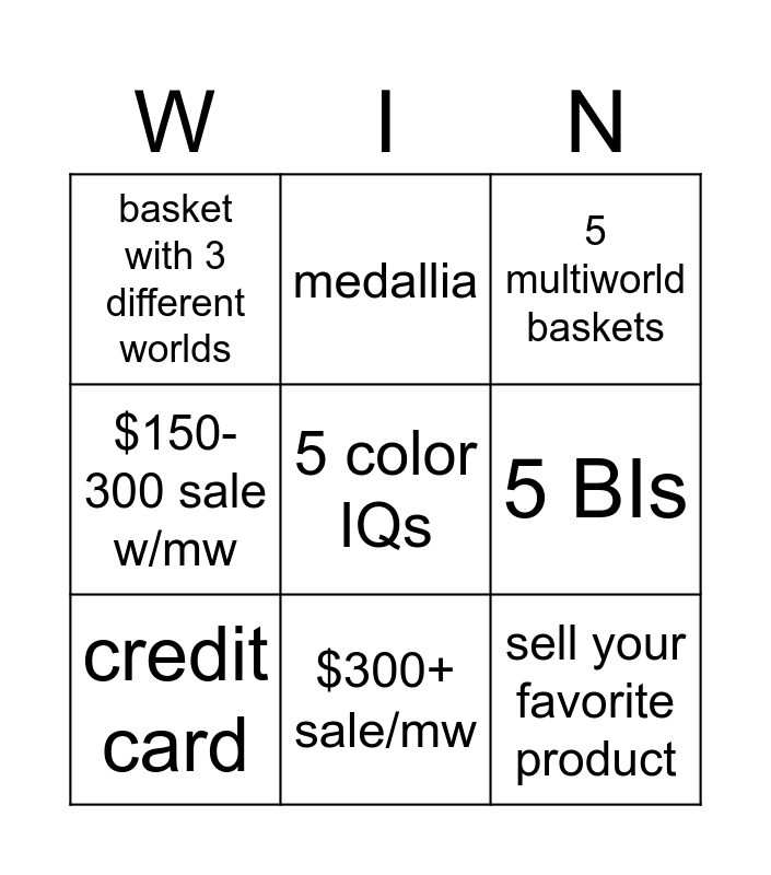This bingo card has 9 words: credit card, 5 multiworld baskets, medallia, $150-300 sale w/mw, basket with 3 different worlds, 5 BIs, 5 color IQs, sell your favorite product and $300+ sale/mw.