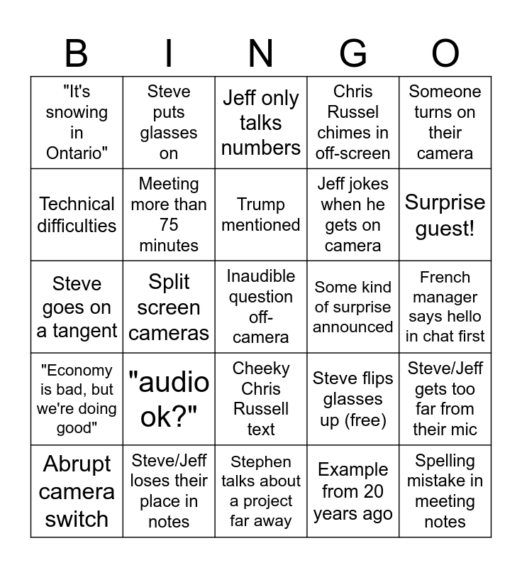 This bingo card has 25 words: "audio ok?", Stephen talks about a project far away, Trump mentioned, Abrupt camera switch, Someone turns on their camera, "It's snowing in Ontario", Technical difficulties, Steve puts glasses on, Some kind of surprise announced, Cheeky Chris Russell text, Jeff jokes when he gets on camera, Steve goes on a tangent, Steve flips glasses up (free), Steve/Jeff gets too far from their mic, Meeting more than 75 minutes, Spelling mistake in meeting notes, French manager says hello in chat first, Jeff only talks numbers, Surprise guest!, Split screen cameras, Inaudible question off-camera, Steve/Jeff loses their place in notes, "Economy is bad, but we're doing good", Chris Russel chimes in off-screen and Example from 20 years ago.