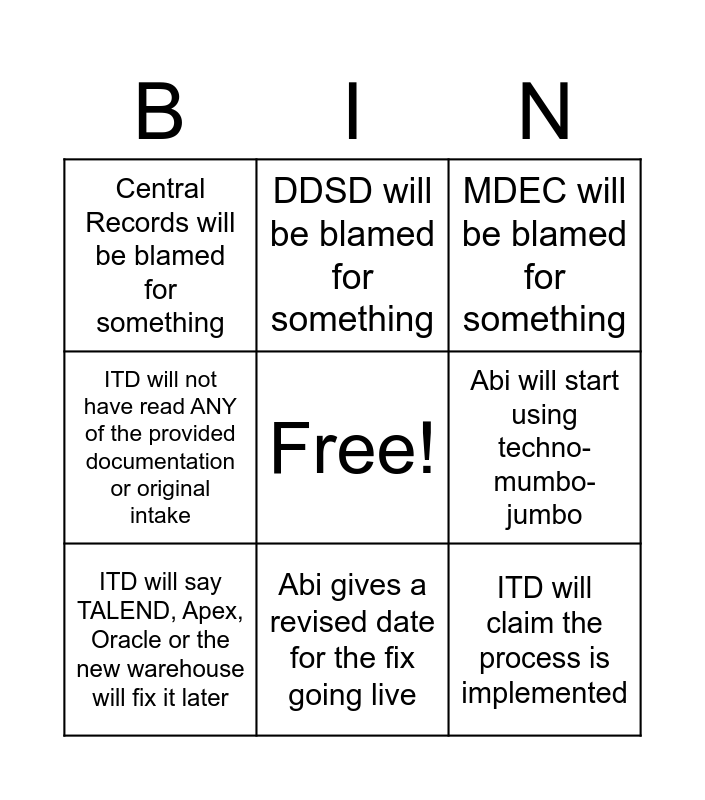 This bingo card has a free space and 8 words: Abi will start using techno-mumbo-jumbo, MDEC will be blamed for something, DDSD will be blamed for something, ITD will say TALEND, Apex, Oracle or the new warehouse will fix it later, Central Records will be blamed for something, ITD will claim the process is implemented, ITD will not have read ANY of the provided documentation or original intake and Abi gives a revised date for the fix going live.