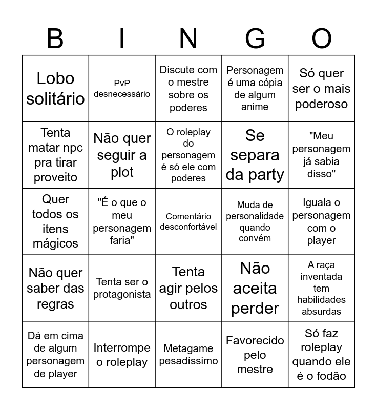This bingo card has 25 words: Tenta ser o protagonista, Metagame pesadíssimo, O roleplay do personagem é só ele com poderes, Dá em cima de algum personagem de player, Só quer ser o mais poderoso, Lobo solitário, Tenta matar npc pra tirar proveito, PvP desnecessário, Muda de personalidade quando convém, Tenta agir pelos outros, Se separa da party, Quer todos os itens mágicos, Não aceita perder, A raça inventada tem habilidades absurdas, Não quer seguir a plot, Só faz roleplay quando ele é o fodão, Iguala o personagem com o player, Discute com o mestre sobre os poderes, "Meu personagem já sabia disso", "É o que o meu personagem faria", Comentário desconfortável, Interrompe o roleplay, Não quer saber das regras, Personagem é uma cópia de algum anime and Favorecido pelo mestre.