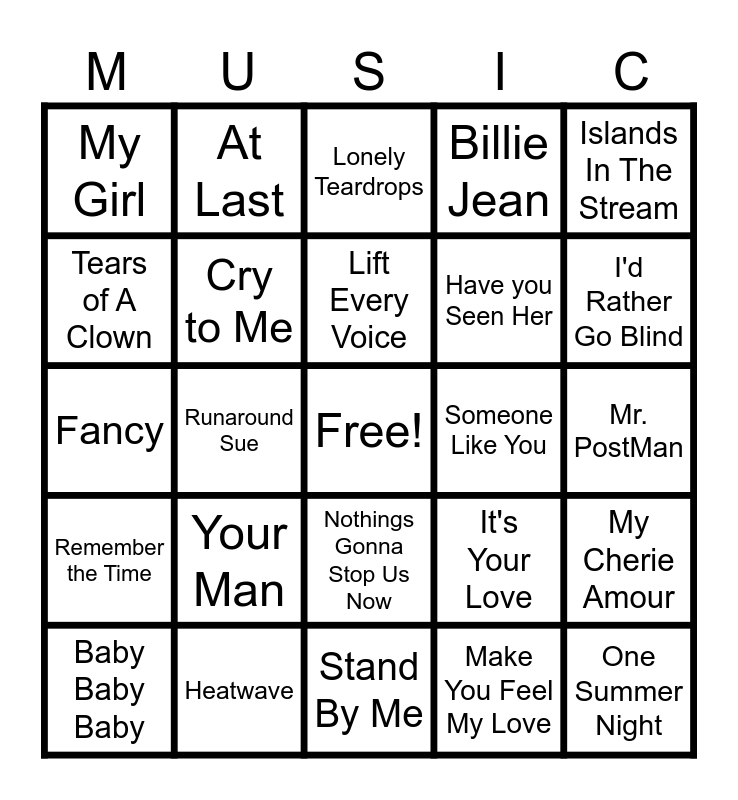 This bingo card has a free space and 29 words: Baby Baby Baby, Stop In the name of Love, Runaround Sue, The Wanderer, My Girl, Lonely Teardrops, Cry to Me, Your Man, Someone Like You, Heatwave, Mr. PostMan, One Summer Night, Stand By Me, Make You Feel My Love, I'd Rather Go Blind, Contagious, Nothings Gonna Stop Us Now, Remember the Time, Islands In The Stream, Fancy, It's Your Love, Rockin' Robin, Have you Seen Her, Tears of A Clown, Billie Jean, At Last, My Cherie Amour, Lift Every Voice and Just My Imagination.