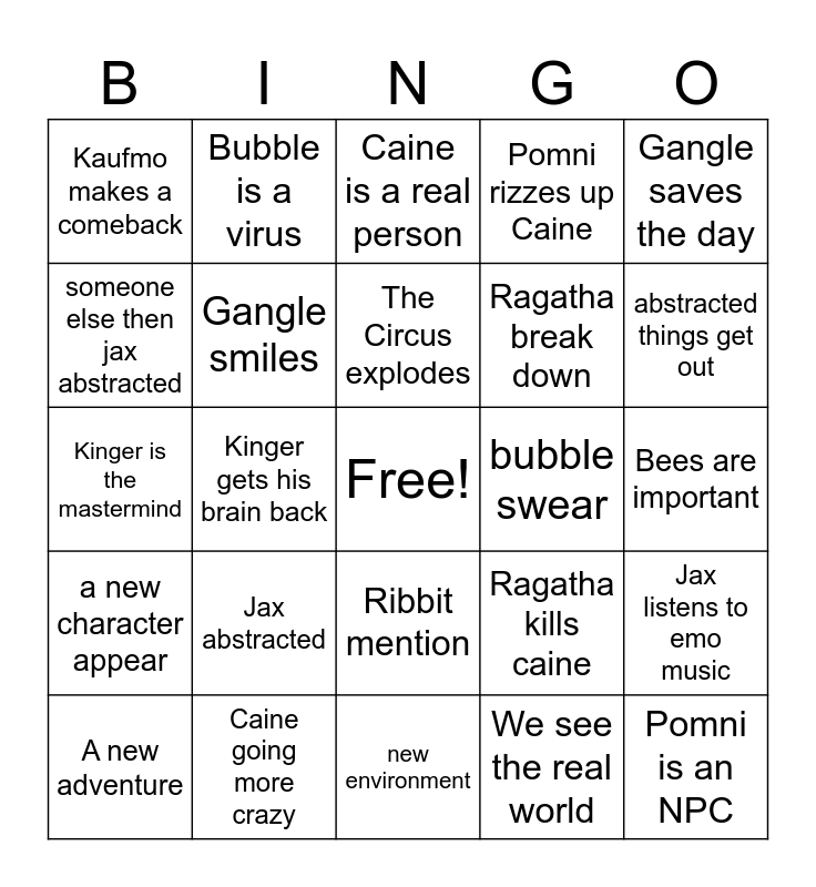 This bingo card has a free space and 24 words: Jax abstracted, Caine going more crazy, The Circus explodes, A new adventure, Gangle saves the day, Kaufmo makes a comeback, someone else then jax abstracted, Bubble is a virus, bubble swear, Ribbit mention, Ragatha break down, Kinger is the mastermind, Ragatha kills caine, Jax listens to emo music, Gangle smiles, We see the real world, Bees are important, Caine is a real person, abstracted things get out, Kinger gets his brain back, Pomni is an NPC, a new character appear, Pomni rizzes up Caine and new environment.