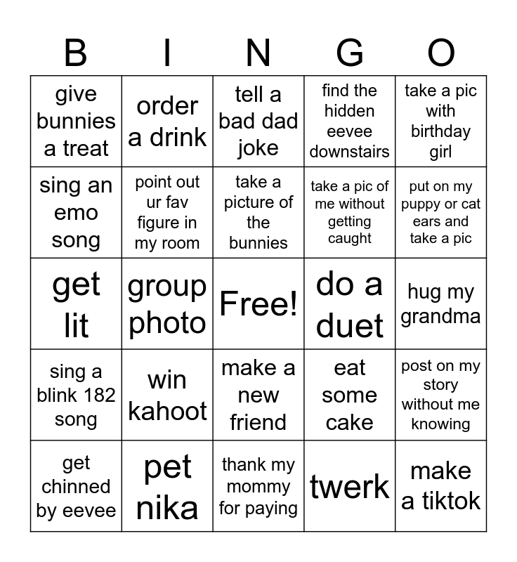 This bingo card has a free space and 24 words: win kahoot, pet nika, take a picture of the bunnies, get chinned by eevee, take a pic with birthday girl, give bunnies a treat, sing an emo song, order a drink, do a duet, make a new friend, take a pic of me without getting caught, get lit, eat some cake, post on my story without me knowing, point out ur fav figure in my room, twerk, hug my grandma, tell a bad dad joke, put on my puppy or cat ears and take a pic, group photo, make a tiktok, sing a blink 182 song, find the hidden eevee downstairs and thank my mommy for paying.