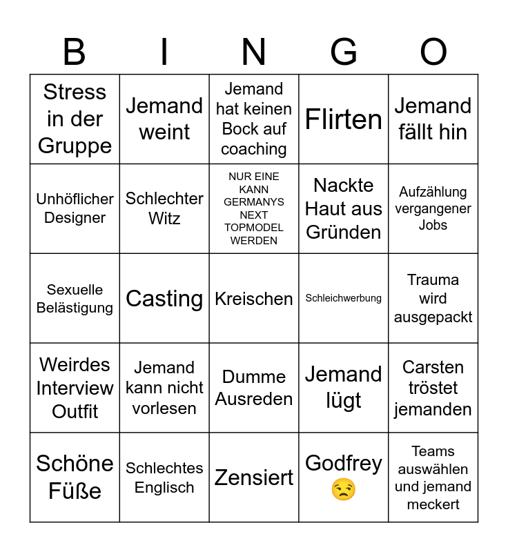 This bingo card has a free space and 24 words: Jemand kann nicht vorlesen, Schlechtes Englisch, NUR EINE KANN GERMANYS NEXT TOPMODEL WERDEN, Schöne Füße, Jemand fällt hin, Stress in der Gruppe, Unhöflicher Designer, Jemand weint, Schleichwerbung, Dumme Ausreden, Nackte Haut aus Gründen, Sexuelle Belästigung, Jemand lügt, Carsten tröstet jemanden, Schlechter Witz, Godfrey😒, Trauma wird ausgepackt, Jemand hat keinen Bock auf coaching, Aufzählung vergangener Jobs, Casting, Teams auswählen und jemand meckert, Weirdes Interview Outfit, Flirten and Zensiert.