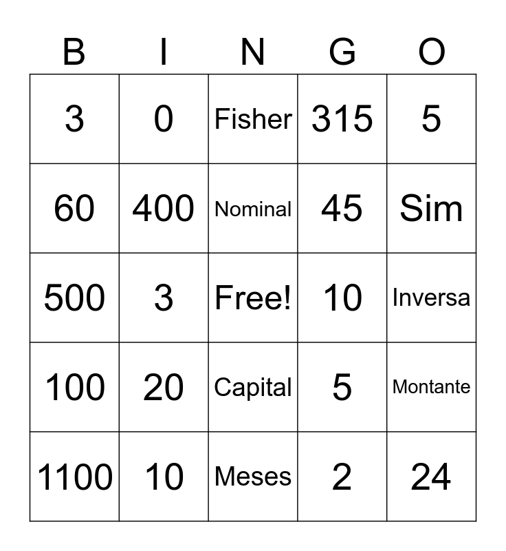 This bingo card has a free space and 24 words: 20, 10, Nominal, 1100, 5, 3, 60, 0, 10, Capital, 45, 500, 5, Montante, 400, 2, Inversa, Fisher, Sim, 3, 24, 100, 315 and Meses.