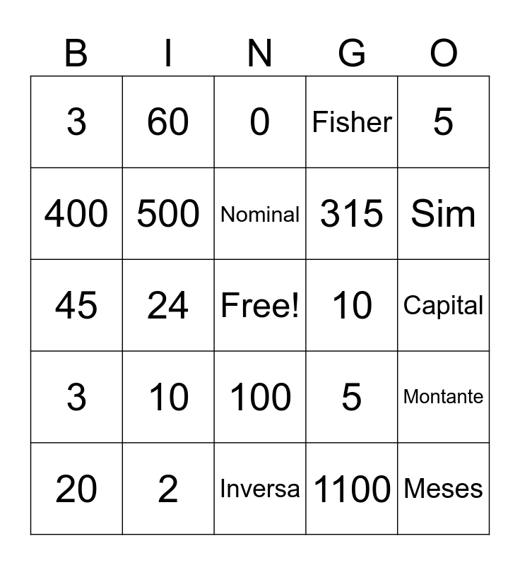 This bingo card has a free space and 24 words: 20, 10, Nominal, 1100, 5, 3, 60, 0, 10, Capital, 45, 500, 5, Montante, 400, 2, Inversa, Fisher, Sim, 3, 24, 100, 315 and Meses.