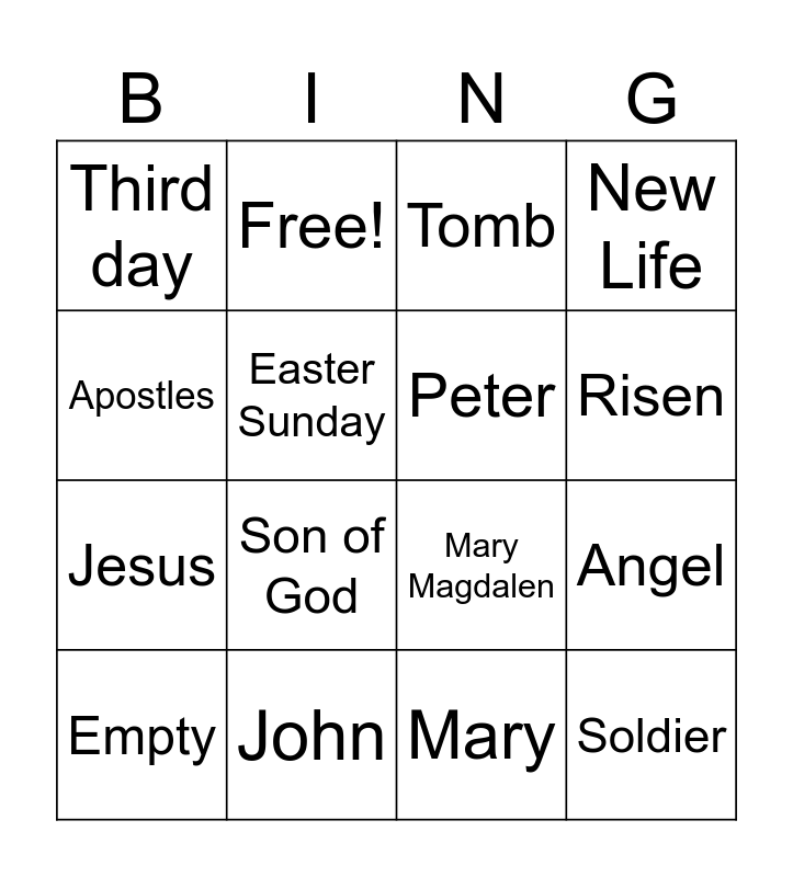 This bingo card has 19 words: Mary Magdalen, Resurrection, Tomb, Soldier, Angel, Apostles, Mary, Third day, Free!, Jesus, Son of God, Easter Sunday, Peter, John, Empty, Easter Season, New Life, Risen and Alleluia!.