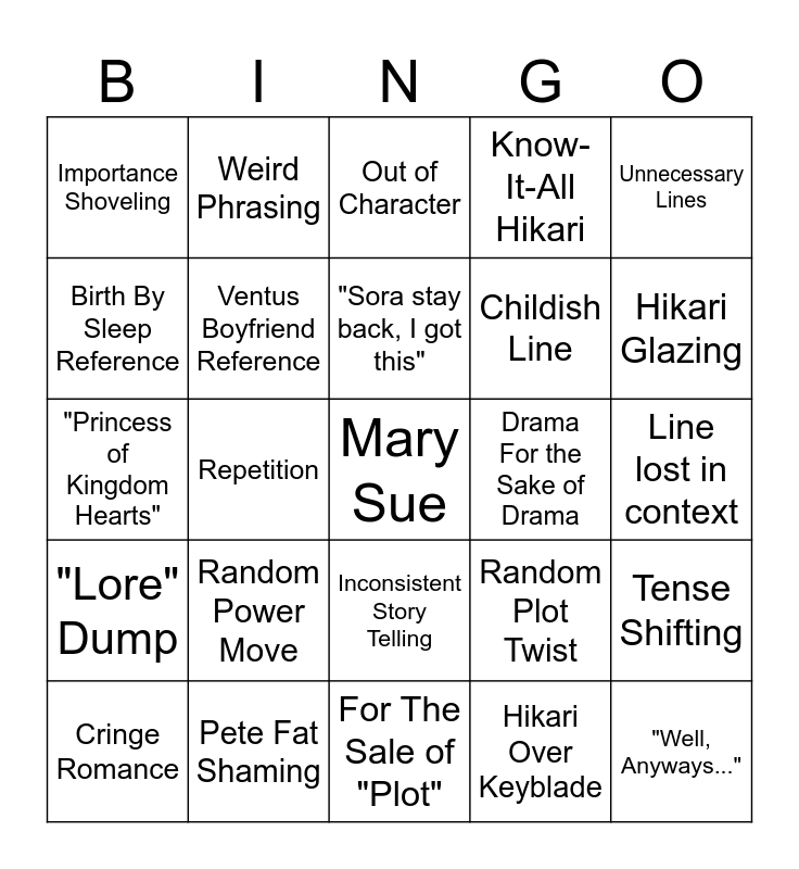 This bingo card has a free space and 24 words: Random Power Move, Pete Fat Shaming, "Sora stay back, I got this", Cringe Romance, Unnecessary Lines, Importance Shoveling, Birth By Sleep Reference, Weird Phrasing, Drama For the Sake of Drama, Inconsistent Story Telling, Childish Line, "Princess of Kingdom Hearts", Random Plot Twist, Tense Shifting, Ventus Boyfriend Reference, Hikari Over Keyblade, Line lost in context, Out of Character, Hikari Glazing, Repetition, "Well, Anyways...", "Lore" Dump, Know-It-All Hikari and For The Sale of "Plot".