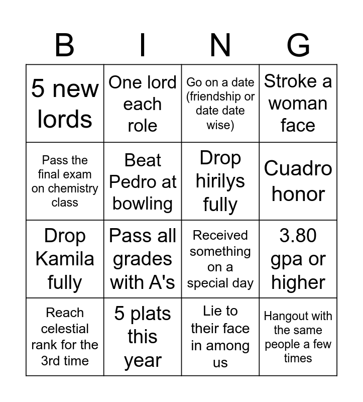 This bingo card has 16 words: Reach celestial rank for the 3rd time, 5 plats this year, Go on a date (friendship or date date wise), Stroke a woman face, Pass the final exam on chemistry class, One lord each role, Received something on a special day, 3.80 gpa or higher, 5 new lords, Beat Pedro at bowling, Lie to their face in among us, Cuadro honor, Drop Kamila fully, Pass all grades with A's, Drop hirilys fully and Hangout with the same people a few times.