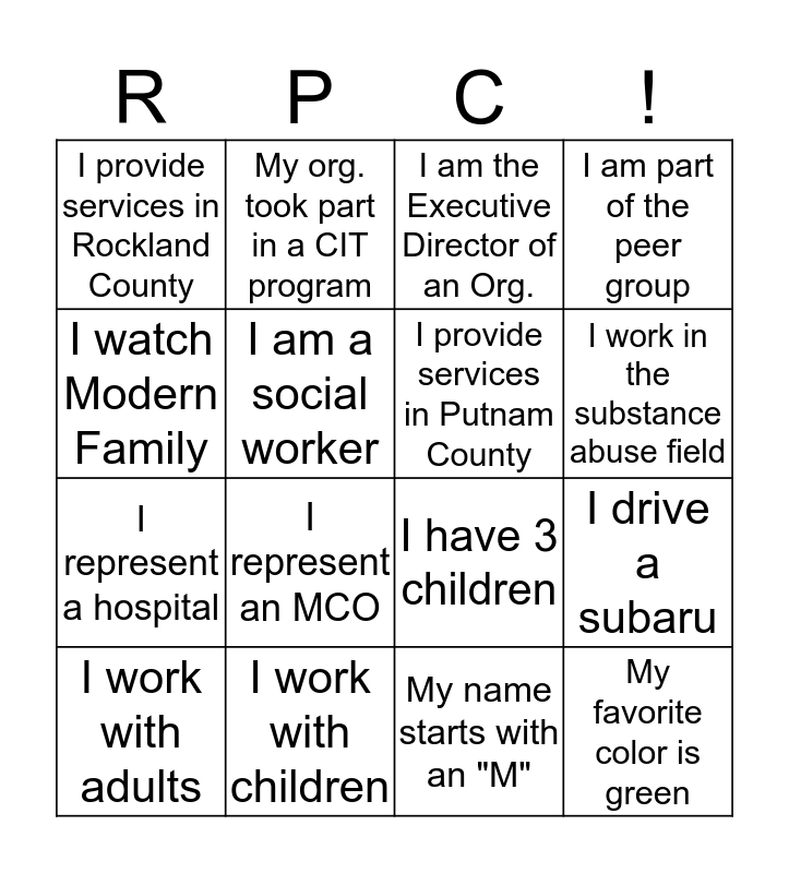 This bingo card has 16 words: I work with children, I drive a subaru, I am the Executive Director of an Org., I provide services in Rockland County, I represent a hospital, My org. took part in a CIT program, I have 3 children, My name starts with an "M", I watch Modern Family, I am a social worker, I work with adults, I am part of the peer group, I represent an MCO, I work in the substance abuse field, I provide services in Putnam County and My favorite color is green.