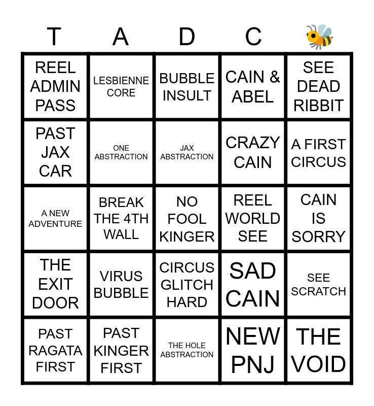 This bingo card has a free space and 24 words: VIRUS BUBBLE, PAST KINGER FIRST, JAX ABSTRACTION, PAST RAGATA FIRST, SEE DEAD RIBBIT, REEL ADMIN PASS, PAST JAX CAR, LESBIENNE CORE, REEL WORLD SEE, CIRCUS GLITCH HARD, CRAZY CAIN, A NEW ADVENTURE, SAD CAIN, SEE SCRATCH, ONE ABSTRACTION, NEW PNJ, CAIN IS SORRY, BUBBLE INSULT, A FIRST CIRCUS, BREAK THE 4TH WALL, THE VOID, THE EXIT DOOR, CAIN & ABEL and THE HOLE ABSTRACTION.