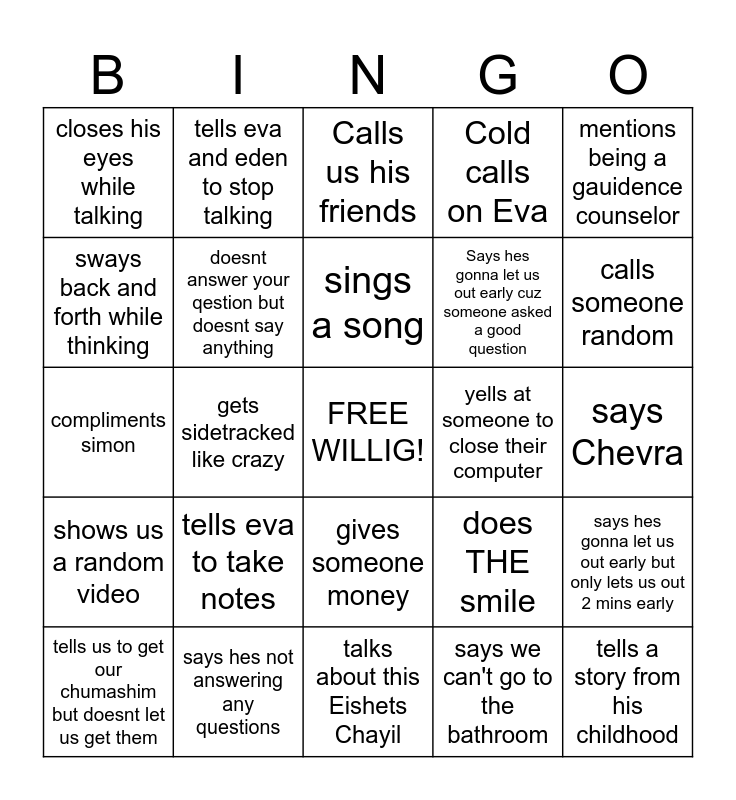This bingo card has a free space and 24 words: tells eva to take notes, says hes not answering any questions, sings a song, tells us to get our chumashim but doesnt let us get them, mentions being a gauidence counselor, closes his eyes while talking, sways back and forth while thinking, tells eva and eden to stop talking, yells at someone to close their computer, gives someone money, Says hes gonna let us out early cuz someone asked a good question, compliments simon, does THE smile, says hes gonna let us out early but only lets us out 2 mins early, doesnt answer your qestion but doesnt say anything, says we can't go to the bathroom, says Chevra, Calls us his friends, calls someone random, gets sidetracked like crazy, tells a story from his childhood, shows us a random video, Cold calls on Eva and talks about this Eishets Chayil.
