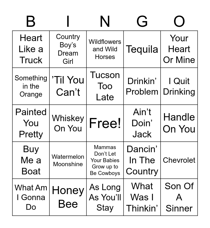 This bingo card has a free space and 60 words: Rain Is A Good Thing, Honey Bee, Night Shift, Buy Me a Boat, What Was I Thinkin’, 23, ’Til You Can’t, All Your’n, Drinkin’ Problem, When It Rains It Pours, Tequila, Whiskey Glasses, Something in the Orange, Fast Car, County Line, Heart Like a Truck, Son Of A Sinner, Your Heart Or Mine, Pretty Little Poison, Tucson Too Late, Ain’t Doin’ Jack, Wildflowers and Wild Horses, What Am I Gonna Do, Chevrolet, Painted You Pretty, Thank God, What My World Spins Around, What He Didn’t Do, I Quit Drinking, 5 Foot 9, I Remember Everything, Next Thing You Know, Outskirts, I’m Not Pretty, Country Boy’s Dream Girl, The Kind of Love We Make, Pour Me A Drink, Whiskey On You, Thinking ’Bout You, Painted You Pretty, Tennessee Orange, Watermelon Moonshine, Handle On You, If He Wanted To He Would, Dancin’ In The Country, What My World Spins Around, Fall In Love, Wanted, Don’t That Sound Like Her, Mammas Don’t Let Your Babies Grow up to Be Cowboys, As Long As You’ll Stay, Take Me Home, Country Roads, Ring of Fire, Two Dozen Roses, Song of the South, This Is How We Roll, No Shoes, No Shirt, No Problems, Watching You, Homegrown and Long Hot Summer.