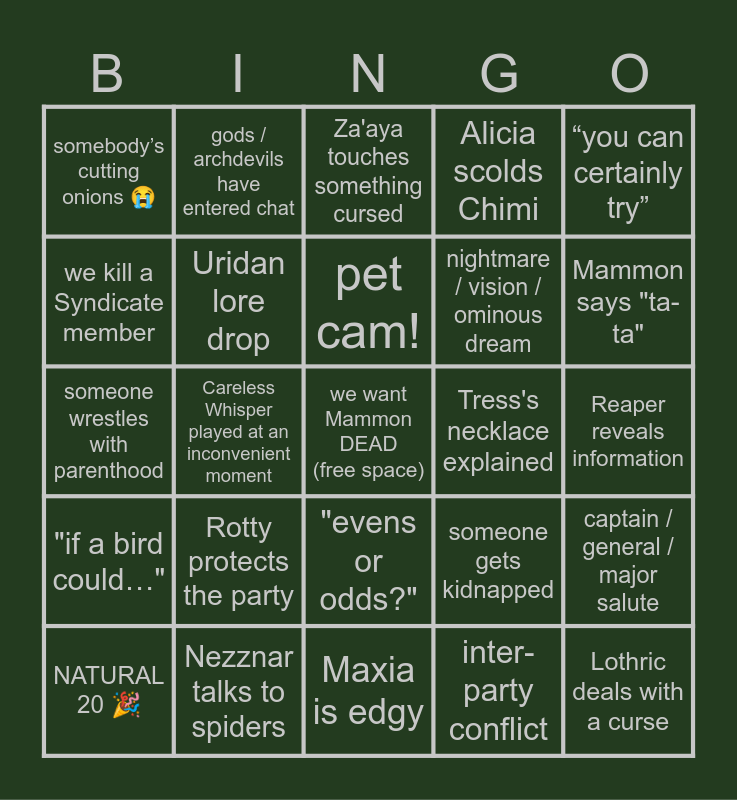 This bingo card has a free space and 29 words: NATURAL 20 🎉, critical fail 💀, Careless Whisper played at an inconvenient moment, roll initiative, somebody’s cutting onions 😭, Za'aya touches something cursed, Uridan lore drop, Rotty protects the party, Tress's necklace explained, Nezznar talks to spiders, Reaper reveals information, Lothric deals with a curse, Maxia is edgy, inter-party conflict, Mammon says "ta-ta", “this session is brought to you by…”, "evens or odds?", "if a bird could…", “you can certainly try”, someone wrestles with parenthood, someone gets kidnapped, halfling luck, nightmare / vision / ominous dream, we kill a Syndicate member, Alicia scolds Chimi, gods / archdevils have entered chat, captain / general / major salute, pet cam! and someone falls unconscious.