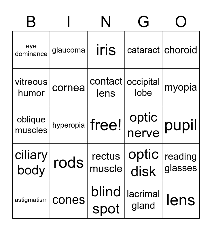 This bingo card has a free space and 29 words: astigmatism, retina, hyperopia, sclera, eye dominance, iris, cornea, rods, optic nerve, cones, pupil, lens, blind spot, lacrimal gland, myopia, aqueous humor, rectus muscle, ciliary body, choroid, oblique muscles, optic disk, optic track, occipital lobe, vitreous humor, cataract, glaucoma, reading glasses, contact lens and bifocal.