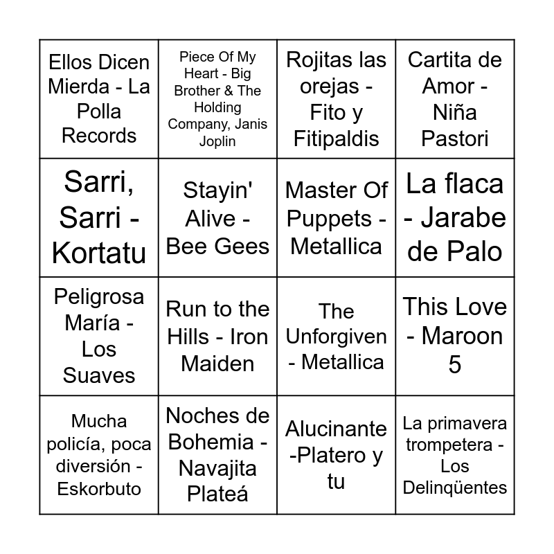 This bingo card has 61 words: Oremus - Mártires del Compás, Callejón sin salida - Barricada, Dolores se llamaba Lola - Los Suaves, La primavera trompetera - Los Delinqüentes, Pata Palo - Pata Negra, I Want Out - Helloween, Master Of Puppets - Metallica, Me estoy quitando - Extremoduro, Peligrosa María - Los Suaves, Okupación - Barricada, Cartita de Amor - Niña Pastori, Maneras de Vivir - Leño, Stayin' Alive - Bee Gees, Still Loving You - Scorpions, En Blanco y Negro - Barricada, Ellos Dicen Mierda - La Polla Records, Mucha policía, poca diversión - Eskorbuto, Sarri, Sarri - Kortatu, Echo de Menos - Kiko Veneno, La flaca - Jarabe de Palo, Noches de Bohemia - Navajita Plateá, Rojitas las orejas - Fito y Fitipaldis, No hay tregua - Barricada, Nothing Else Matters - Metallica, Seek & Destroy - Metallica, The Number of the Beast - Iron Maiden, Symphony Of Destruction - Megadeth, No puedo dejar el Rock - Los Suaves, Run to the Hills - Iron Maiden, Dolor - Agua Bendita, Que te Den - Amparanoia, Playas de Barbate - Chambao, Miguel Campello, De los malos - Elbicho, Ama, ama, ama y ensancha el alma - Extremoduro, Piece Of My Heart - Big Brother & The Holding Company, Janis Joplin, Stairway to Heaven - Led Zeppelin, Salve - La Polla Records, This Love - Maroon 5, Suerte - Shakira, The Unforgiven - Metallica, Devil Came to Me - Dover, Flojos de pantalón - Rosendo, Alucinante -Platero y tu, Tu Mirá - Lole y Manuel, La casa por el tejado - Fito y Fitipaldis, No puedo vivir sin ti - Los Ronaldos, Como Camaón - Estopa, Huesos - Los Burros, El roce de tu cuerpo - Platero y tu, Hay poco Rock'n'Roll - Platero y tu, Mala vida - Mano negra, Could You Be Loved - Bob Marley & The Wailers, Is This Love - Bob Marley & The Wailers, Vente Vente - Mártires del Compás, The Trooper - Iron Maiden, Rainbow In The Dark - Dio, Sarandonga - Lolita, Como un burro amarrado en la puerta del baile - El Último de la Fila, No estamos lokos - Ketama, Cacho a Cacho - Estopa and El aire de la calle - Los Delinqüentes.