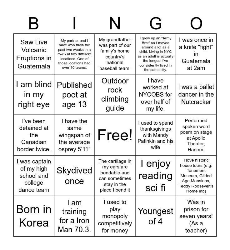 This bingo card has a free space and 31 words: I used to play monopoly competitively for money, When i was in jr. hs i was part of the band that was able to play for willie colon (r.i.p salsa legend). I played my clarinet and the bottom piece of my clarinet kept falling off but it was still a great performance!, I have the same wingspan of the average osprey 5’11”, I don’t know how to swim., Saw Live Volcanic Eruptions in Guatemala, My grandfather was part of our family's home country's national baseball team., Published poet at age 13, I enjoy reading sci fi, I used to spend thanksgivings with Mandy Patinkin and his wife, Youngest of 4, Performed spoken word poem on stage at Apollo Theater, Harlem., Was in prison for seven years! (As a teacher), Went to the same school as David Thomas Abercrombie, co-founder of Abercrombie & Fitch in, I LOVE palindromes, I was a ballet dancer in the Nutcracker, I played the harp as a child, I love historic house tours (e.g. Tenement Museum, Gilded Age Mansions, Teddy Roosevelt's Home etc), Skydived once, I was captain of my high school and college dance team, The cartilage in my ears are bendable and can sometimes stay in the place I bend it, I was once in a knife "fight" in Guatemala at 2am, Played a D1 college sport, Born in Korea, My partner and I have won trivia the past two weeks in a row - at two different locations. One of those locations had over 10 teams., I have worked at NYCOBS for over half of my life., I am blind in my right eye, I grew up an "Army Brat" so I moved around a lot as a child. Living in NYC as an adult is actually the longest I've consistently lived in the same city., I've been detained at the Canadian border twice., I am training for a Iron Man 70.3., Outdoor rock climbing guide and I am a certified scuba diver and got to go on night dives to learn about coral spawning with scientists from the local college as a high school student..