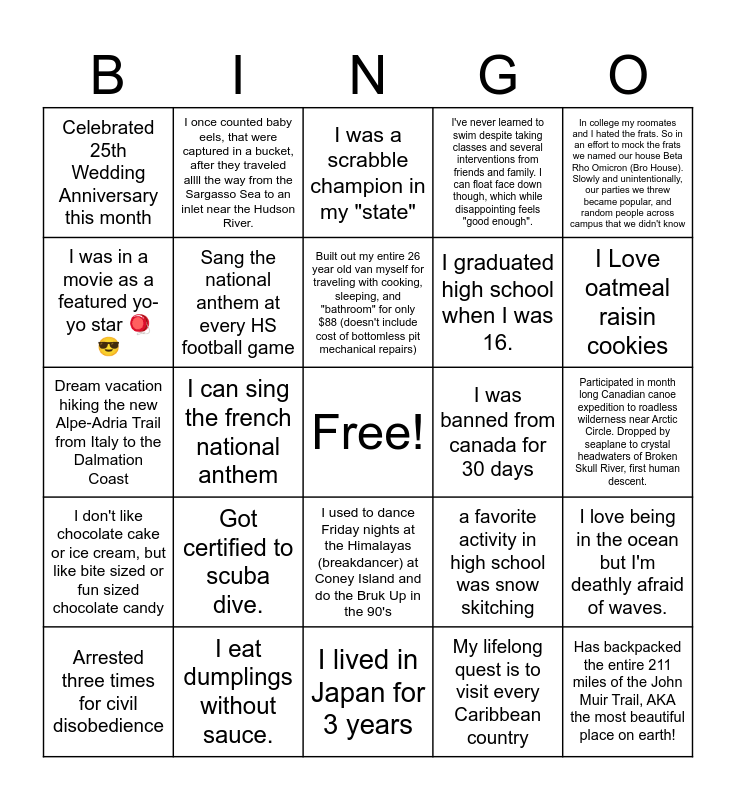 This bingo card has a free space and 31 words: I lived in Japan for 3 years, i danced in the puerto rican parade with my dance group for 5 years in a row. it was alot of dancing and walking!, I can sing the french national anthem, I once fit everything on one Uber when moving., Celebrated 25th Wedding Anniversary this month, I was a scrabble champion in my "state", Sang the national anthem at every HS football game, a favorite activity in high school was snow skitching, I was banned from canada for 30 days, My lifelong quest is to visit every Caribbean country, Participated in month long Canadian canoe expedition to roadless wilderness near Arctic Circle. Dropped by seaplane to crystal headwaters of Broken Skull River, first human descent., Has backpacked the entire 211 miles of the John Muir Trail, AKA the most beautiful place on earth!, My hair has been every color of the rainbow, My socks didn't match until Middle School, I Love oatmeal raisin cookies, I'm allergic to mangoes, I love being in the ocean but I'm deathly afraid of waves., Got certified to scuba dive., I don't like chocolate cake or ice cream, but like bite sized or fun sized chocolate candy, I used to dance Friday nights at the Himalayas (breakdancer) at Coney Island and do the Bruk Up in the 90's, In college my roomates and I hated the frats. So in an effort to mock the frats we named our house Beta Rho Omicron (Bro House). Slowly and unintentionally, our parties we threw became popular, and random people across campus that we didn't know, Was in my high school anime club, Arrested three times for civil disobedience, I once counted baby eels, that were captured in a bucket, after they traveled allll the way from the Sargasso Sea to an inlet near the Hudson River., I graduated high school when I was 16., I was in a movie as a featured yo-yo star 🪀 😎, I've never learned to swim despite taking classes and several interventions from friends and family. I can float face down though, which while disappointing feels "good enough"., Dream vacation hiking the new Alpe-Adria Trail from Italy to the Dalmation Coast, I eat dumplings without sauce., Built out my entire 26 year old van myself for traveling with cooking, sleeping, and "bathroom" for only $88 (doesn't include cost of bottomless pit mechanical repairs) and My best friend and I both tore our ACLs on the same day, the week before our joint Sweet 16!.