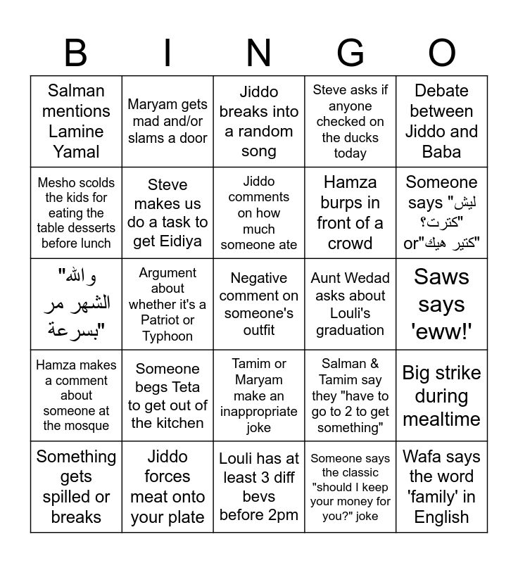 This bingo card has 25 words: Someone begs Teta to get out of the kitchen, Louli has at least 3 diff bevs before 2pm, Jiddo comments on how much someone ate, Something gets spilled or breaks, Debate between Jiddo and Baba, Salman mentions Lamine Yamal, Mesho scolds the kids for eating the table desserts before lunch, Maryam gets mad and/or slams a door, Aunt Wedad asks about Louli's graduation, Tamim or Maryam make an inappropriate joke, Hamza burps in front of a crowd, "والله الشهر مر بسرعة", Salman & Tamim say they "have to go to 2 to get something", Big strike during mealtime, Steve makes us do a task to get Eidiya, Wafa says the word 'family' in English, Saws says 'eww!', Jiddo breaks into a random song, Someone says "ليش كترت؟" or"كتير هيك", Argument about whether it's a Patriot or Typhoon, Negative comment on someone's outfit, Jiddo forces meat onto your plate, Hamza makes a comment about someone at the mosque, Steve asks if anyone checked on the ducks today and Someone says the classic "should I keep your money for you?" joke.
