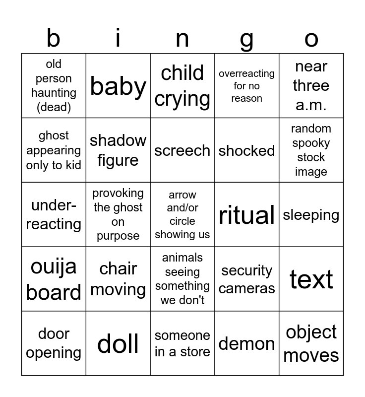 This bingo card has a free space and 24 words: chair moving, doll, screech, door opening, near three a.m., old person haunting (dead), ghost appearing only to kid, baby, ritual, animals seeing something we don't, shocked, under-reacting, security cameras, text, shadow figure, demon, sleeping, child crying, random spooky stock image, provoking the ghost on purpose, object moves, ouija board, overreacting for no reason and someone in a store.