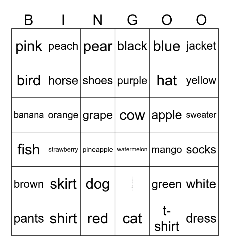 This bingo card has 36 words: dog cat bird fish cow horse red blue green yellow black white orange purple pink brown apple banana pear grape strawberry watermelon pineapple mango peach hat shirt shoes, dog, cat, bird, fish, cow, horse, red, blue, green, yellow, black, white, orange, purple, pink, brown, apple, banana, pear, grape, strawberry, watermelon, pineapple, mango, peach, hat, shirt, shoes, jacket, dress, pants, socks, sweater, skirt and t-shirt.