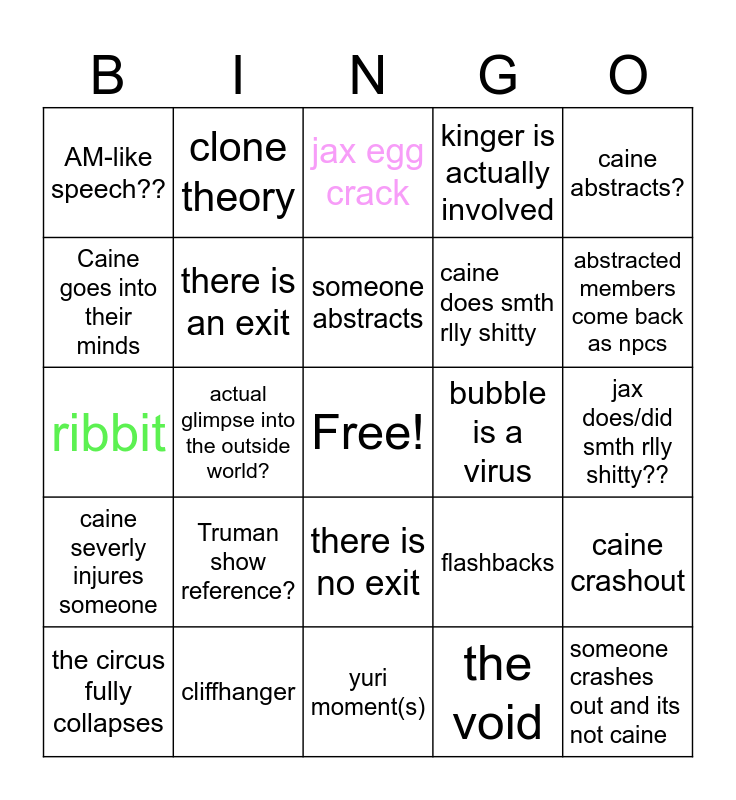This bingo card has a free space and 24 words: Truman show reference?, cliffhanger, someone abstracts, the circus fully collapses, caine abstracts?, AM-like speech??, Caine goes into their minds, clone theory, bubble is a virus, there is no exit, caine does smth rlly shitty, ribbit, flashbacks, caine crashout, there is an exit, the void, jax does/did smth rlly shitty??, jax egg crack, abstracted members come back as npcs, actual glimpse into the outside world?, someone crashes out and its not caine, caine severly injures someone, kinger is actually involved and yuri moment(s).