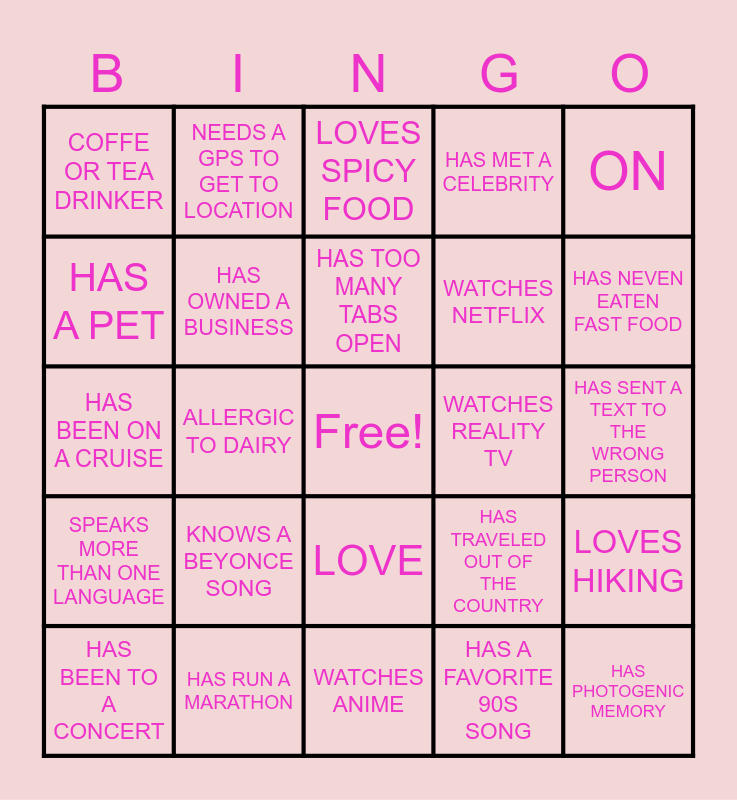 This bingo card has a free space and 27 words: HAS TRAVELED OUT OF THE COUNTRY, HAS GONE SKYDIVING, WATCHES NETFLIX, WATCHES ANIME, HAS A PET, LOVES SPICY FOOD, NEEDS A GPS TO GET TO LOCATION, SPEAKS MORE THAN ONE LANGUAGE, WATCHES REALITY TV, LOVES HIKING, HAS BEEN ON A CRUISE, HAS MET A CELEBRITY, HAS BEEN TO A CONCERT, HAS RUN A MARATHON, HAS NEVEN EATEN FAST FOOD, HAS ZERO DEBT, HAS OWNED A BUSINESS, HAS TOO MANY TABS OPEN, KNOWS A BEYONCE SONG, COFFE OR TEA DRINKER, HAS SENT A TEXT TO THE WRONG PERSON, HAS A FAVORITE 90S SONG, ALLERGIC TO DAIRY, HAS PHOTOGENIC MEMORY, LOVE, ON and ON TOP.