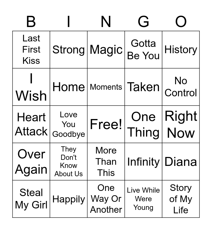 This bingo card has a free space and 44 words: Right Now, Story of My Life, Drag Me Down, Steal My Girl, Little Things, Live While Were Young, Magic, Best Song Ever, History, Happily, Gotta Be You, One Thing, More Than This, They Don't Know About Us, Rock Me, One Way Or Another, Midnight Memories, Heart Attack, Night Changes, No Control, Strong, Back for You, Where Do Broken Hearts Go, Last First Kiss, Fireproof, Right Now, Up All Night, Stockholm Syndrome, Infinity, Over Again, Ready To Run, Diana, Girl Almighty, Dont Forget Where You Belong, Love You Goodbye, Stand Up, Fools Gold, Half A Heart, Moments, I Wish, Taken, Na Na Na, Home and I Should Have Kissed You.