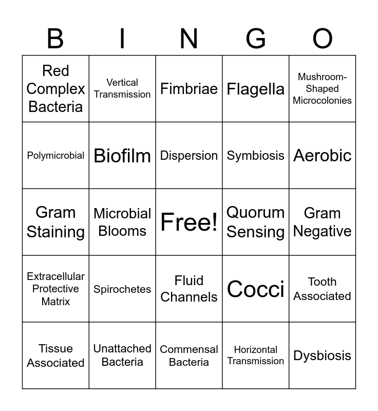 This bingo card has a free space and 34 words: Microbe, Bacterium, Cell Envelope, Gram Positive, Gram Negative, Polymicrobial, Biofilm, Commensal Bacteria, Symbiosis, Dysbiosis, Gram Staining, Vertical Transmission, Horizontal Transmission, Acquired Salivary Pellicle, Extracellular Protective Matrix, Microbial Blooms, Fluid Channels, Quorum Sensing, Tooth Associated, Tissue Associated, Unattached Bacteria, Planktonic, Flagella, Aerobic, Anaerobic, Spirochetes, Fimbriae, Coaggregation, Mushroom-Shaped Microcolonies, Red Complex Bacteria, Orange Complex Bacteria, Dispersion, Cocci and Rods.