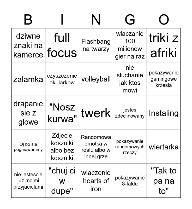 This bingo card has a free space and 24 words: Zdjecie koszulki albo bez koszulki, "chuj ci w dupe", volleyball, nie jestescie juz moimi przyjacielami, triki z afriki, dziwne znaki na kamerce, zalamka, full focus, jestes zdeclinowany, Randomowa emotka w realu albo w innej grze, nie sluchanie jak ktos mowi, drapanie sie z glowe, pokazywanie randomowych rzeczy, wiertarka, czyszczenie okularkow, pokazywanie 8-faldu, Instaling, Flashbang na twarzy, pokazywanie gamingowe krzesla, "Nosz kurwa", "Tak to pa na to", Oj bo sie pogniewammy, wlaczanie 100 milionow gier na raz and wlaczenie hearts of iron.