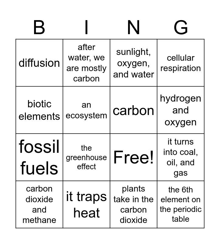 This bingo card has 21 words: it traps heat, the burning of fossil fuels, after water, we are mostly carbon, into the air, plants take in the carbon dioxide, carbon, diffusion, sunlight, oxygen, and water, Free!, hydrogen and oxygen, fossil fuels, cellular respiration, the 6th element on the periodic table, photosynthesis, an ecosystem, carbon dioxide, carbon dioxide and methane, the greenhouse effect, biotic elements, it turns into coal, oil, and gas and they are non living.