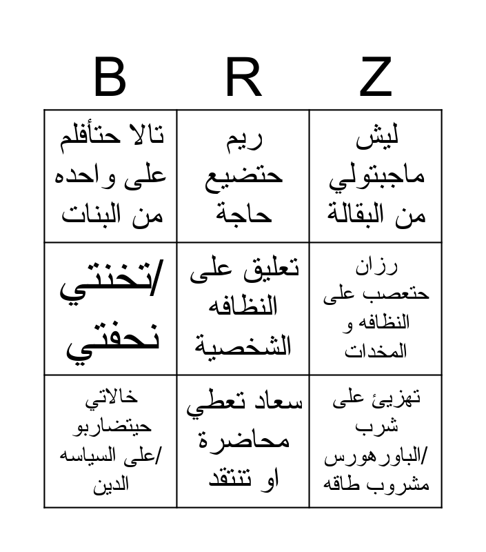 This bingo card has a free space and 8 words: رزان حتعصب على النظافه و المخدات, ليش ماجبتولي من البقالة, ريم حتضيع حاجة, خالاتي حيتضاربو على السياسه/الدين, تالا حتأفلم على واحده من البنات, تهزيئ على شرب الباورهورس/مشروب طاقه, تخنتي/نحفتي and سعاد تعطي محاضرة او تنتقد.