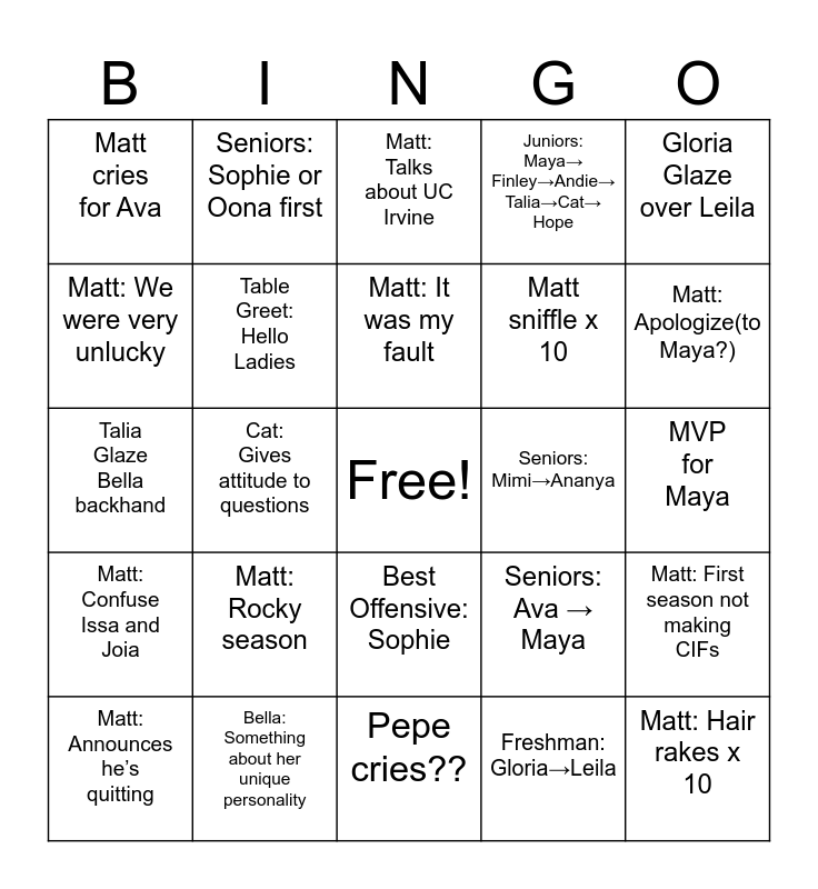 This bingo card has a free space and 24 words: Matt: Rocky season, Bella: Something about her unique personality, Matt: It was my fault, Matt: Announces he’s quitting, Gloria Glaze over Leila, Matt cries for Ava, Matt: We were very unlucky, Seniors: Sophie or Oona first, Seniors: Mimi→Ananya, Best Offensive: Sophie, Matt sniffle x 10, Talia Glaze Bella backhand, Seniors: Ava → Maya, Matt: First season not making CIFs, Table Greet: Hello Ladies, Freshman: Gloria→Leila, MVP for Maya, Matt: Talks about UC Irvine, Matt: Apologize(to Maya?), Cat: Gives attitude to questions, Matt: Hair rakes x 10, Matt: Confuse Issa and Joia, Juniors: Maya→ Finley→Andie→ Talia→Cat→ Hope and Pepe cries??.