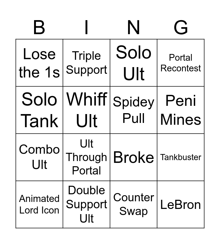 This bingo card has 16 words: Double Support Ult, Tankbuster, Solo Ult, Lose the 1s, Combo Ult, Triple Support, Broke, Counter Swap, Solo Tank, Whiff Ult, Animated Lord Icon, Portal Recontest, Ult Through Portal, Peni Mines, Spidey Pull and LeBron.