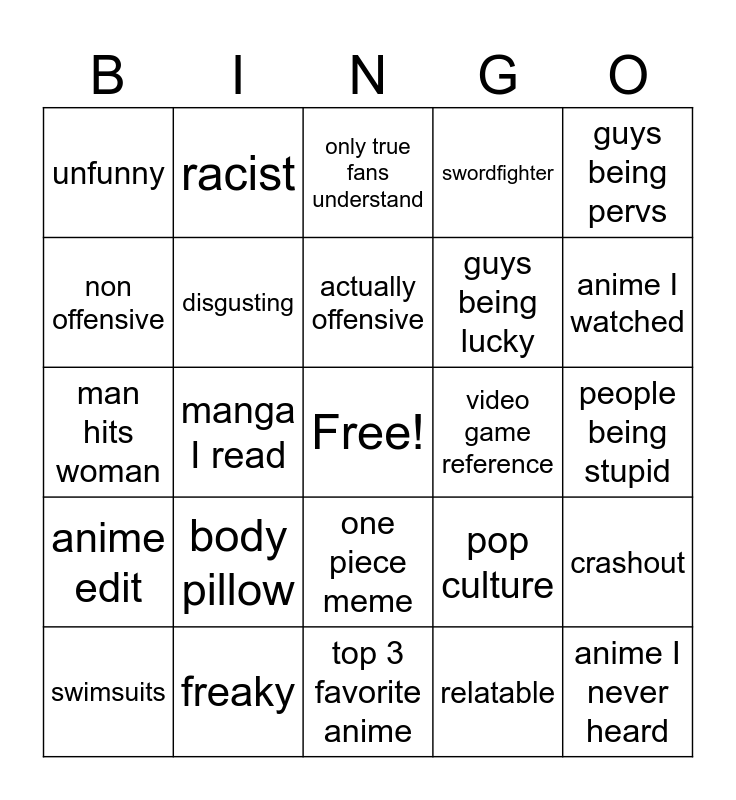 This bingo card has a free space and 24 words: body pillow, freaky, actually offensive, swimsuits, guys being pervs, unfunny, non offensive, racist, video game reference, one piece meme, guys being lucky, man hits woman, pop culture, crashout, disgusting, relatable, people being stupid, only true fans understand, anime I watched, manga I read, anime I never heard, anime edit, swordfighter and top 3 favorite anime.
