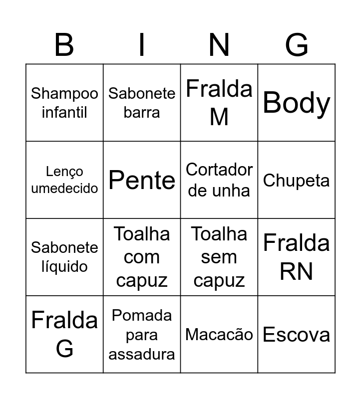This bingo card has 20 words: Fralda RN, Fralda P, Fralda M, Fralda tecido, Fralda G, Lenço umedecido, Pomada para assadura, Shampoo infantil, Sabonete líquido, Sabonete barra, Toalha com capuz, Toalha sem capuz, Pente, Escova, Cortador de unha, Mamadeira, Chupeta, Body, Macacão and Conjunto.