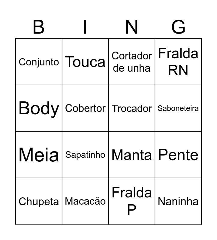 This bingo card has 20 words: Pente, Escova, Cortador de unha, Mamadeira, Chupeta, Body, Macacão, Conjunto, Meia, Touca, Sapatinho, Manta, Cobertor, Naninha, Trocador, Frauda de boca, Saboneteira, Fralda RN, Fralda P and Fralda M.