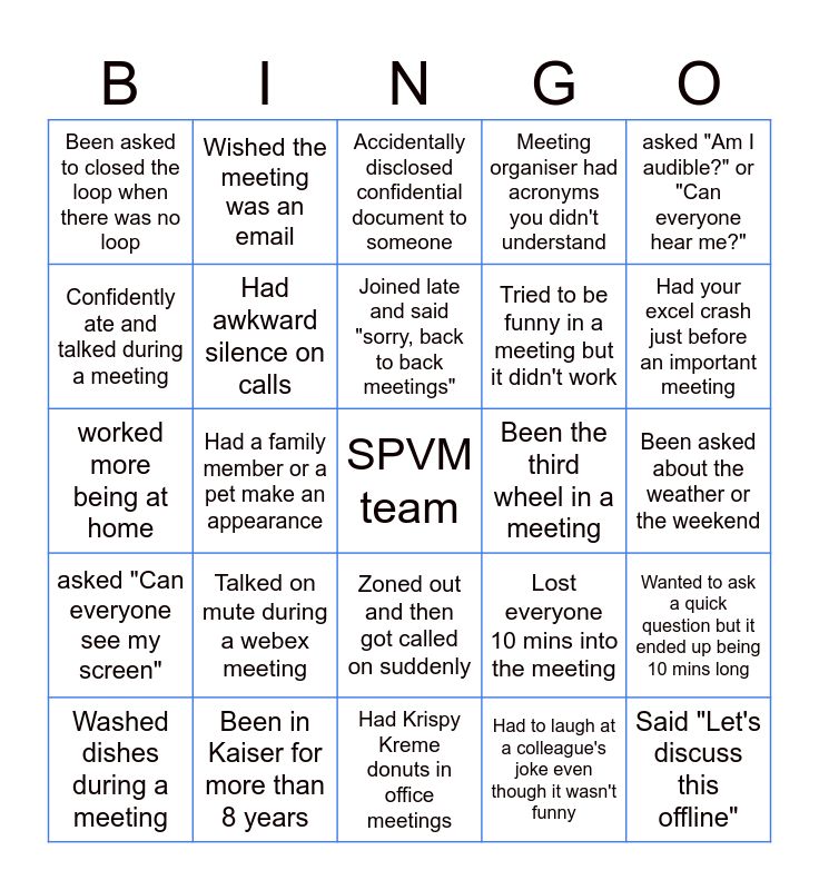 This bingo card has a free space and 24 words: Talked on mute during a webex meeting, Been in Kaiser for more than 8 years, Joined late and said "sorry, back to back meetings", Washed dishes during a meeting, asked "Am I audible?" or "Can everyone hear me?", Been asked to closed the loop when there was no loop, Confidently ate and talked during a meeting, Wished the meeting was an email, Been the third wheel in a meeting, Zoned out and then got called on suddenly, Tried to be funny in a meeting but it didn't work, worked more being at home, Lost everyone 10 mins into the meeting, Wanted to ask a quick question but it ended up being 10 mins long, Had awkward silence on calls, Had to laugh at a colleague's joke even though it wasn't funny, Been asked about the weather or the weekend, Accidentally disclosed confidential document to someone, Had your excel crash just before an important meeting, Had a family member or a pet make an appearance, Said "Let's discuss this offline", asked "Can everyone see my screen", Meeting organiser had acronyms you didn't understand and Had Krispy Kreme donuts in office meetings.