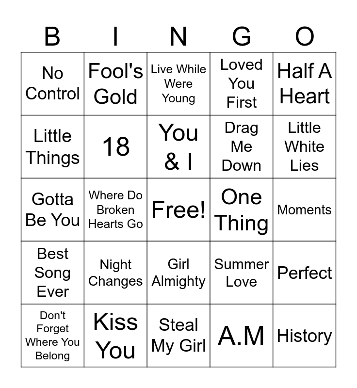 This bingo card has a free space and 27 words: Summer Love, Story Of My Life, Drag Me Down, Steal My Girl, Little Things, Live While Were Young, Fool's Gold, Best Song Ever, One Thing, Perfect, Gotta Be You, Loved You First, Don't Forget Where You Belong, Kiss You, Little White Lies, One Way Or Another, 18, You & I, Night Changes, No Control, Moments, A.M, Where Do Broken Hearts Go, History, Girl Almighty, Half A Heart and Na Na Na.