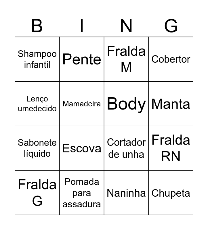 This bingo card has 20 words: Fralda RN, Fralda P, Fralda M, Fralda tecido, Fralda G, Lenço umedecido, Pomada para assadura, Shampoo infantil, Sabonete líquido, Pente, Escova, Cortador de unha, Mamadeira, Chupeta, Body, Sapatinho, Manta, Cobertor, Naninha and Trocador.