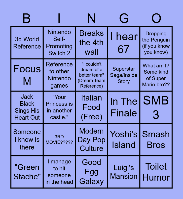 This bingo card has a free space and 24 words: 3RD MOVIE?????, I manage to hit someone in the head, "I couldn't dream of a better team" (Dream Team Reference), "Green Stache", Dropping the Penguin (if you know you know), 3d World Reference, Focus M, Nintendo Self-Promoting Switch 2, In The Finale, Modern Day Pop Culture, Superstar Saga/Inside Story, Jack Black Sings His Heart Out, Yoshi's Island, Smash Bros, Reference to other Nintendo games, Luigi's Mansion, SMB 3, Breaks the 4th wall, What am I? Some kind of Super Mario bro??, "Your Princess is in another castle.", Toilet Humor, Someone I know is there, I hear 67 and Good Egg Galaxy.