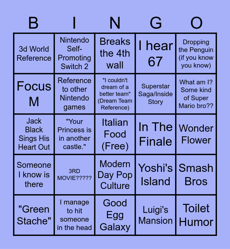 This bingo card has a free space and 24 words: 3RD MOVIE?????, I manage to hit someone in the head, "I couldn't dream of a better team" (Dream Team Reference), "Green Stache", Dropping the Penguin (if you know you know), 3d World Reference, Focus M, Nintendo Self-Promoting Switch 2, In The Finale, Modern Day Pop Culture, Superstar Saga/Inside Story, Jack Black Sings His Heart Out, Yoshi's Island, Smash Bros, Reference to other Nintendo games, Luigi's Mansion, Wonder Flower, Breaks the 4th wall, What am I? Some kind of Super Mario bro??, "Your Princess is in another castle.", Toilet Humor, Someone I know is there, I hear 67 and Good Egg Galaxy.