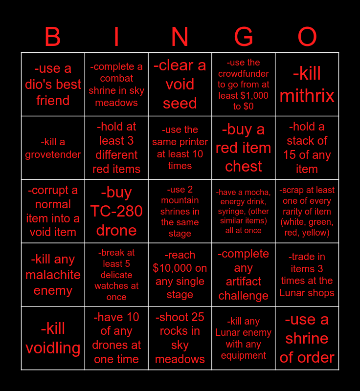 This bingo card has a free space and 29 words: -kill voidling, -clear void fields, -buy TC-280 drone, -recycle a red item, -use a dio's best friend, -clear a void seed, -hold at least 3 different red items, -break at least 5 delicate watches at once, -have a mocha, energy drink, syringe, (other similar items) all at once, -have 10 of any drones at one time, -scrap at least one of every rarity of item (white, green, red, yellow), -use a shrine of order, -shoot 25 rocks in sky meadows, -kill any Lunar enemy with any equipment, -hold a stack of 15 of any item, -get a red item from a shipping request form drop, -reach $10,000 on any single stage, -kill any malachite enemy, -kill mithrix, -corrupt a normal item into a void item, -complete any artifact challenge, -kill the alloy worship unit, -buy a red item chest, -kill a grovetender, -use the crowdfunder to go from at least $1,000 to $0, -complete a combat shrine in sky meadows, -trade in items 3 times at the Lunar shops, -use the same printer at least 10 times and -get the bands from aqueduct.