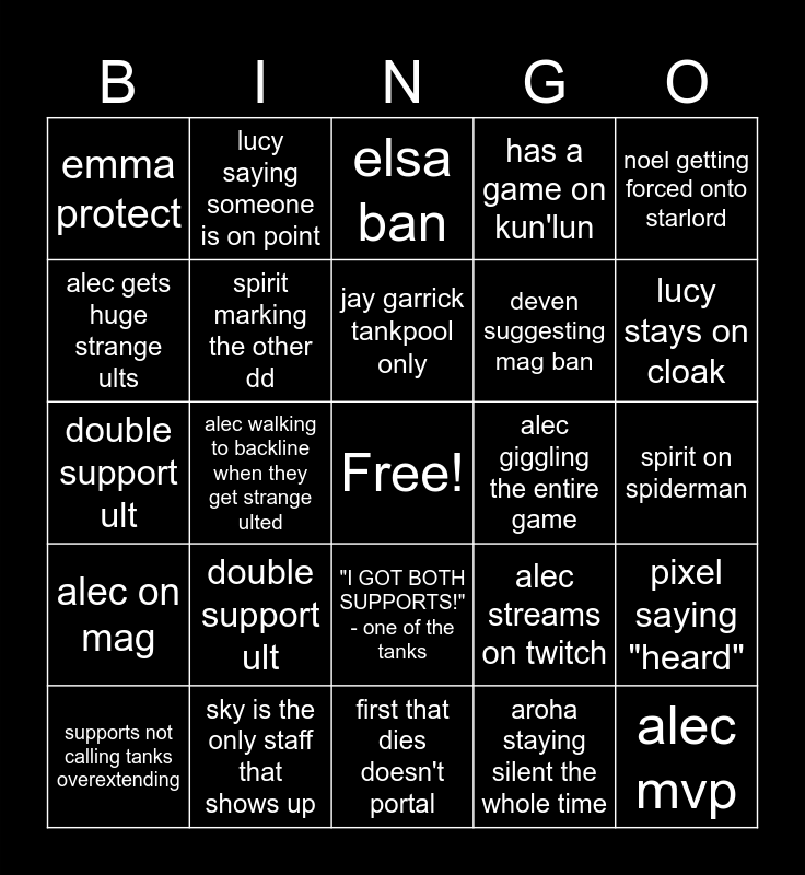 This bingo card has a free space and 24 words: double support ult, sky is the only staff that shows up, jay garrick tankpool only, supports not calling tanks overextending, noel getting forced onto starlord, emma protect, alec gets huge strange ults, lucy saying someone is on point, alec giggling the entire game, "I GOT BOTH SUPPORTS!" - one of the tanks, deven suggesting mag ban, double support ult, alec streams on twitch, pixel saying "heard", spirit marking the other dd, aroha staying silent the whole time, spirit on spiderman, elsa ban, lucy stays on cloak, alec walking to backline when they get strange ulted, alec mvp, alec on mag, has a game on kun'lun and first that dies doesn't portal.