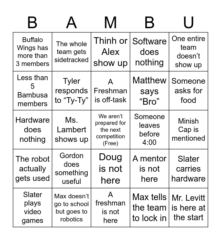 This bingo card has a free space and 27 words: A mentor is not here, Jonte is late, Matthew says “Bro”, A freshman is not here, Less than 5 Bambusa members, Thinh or Alex show up, The whole team gets sidetracked, The robot actually gets used, Someone leaves before 4:00, Slater carries hardware, Hardware does nothing, Software does nothing, Slater plays video games, Max doesn’t go to school but goes to robotics, Someone asks for food, Max brings food, Tyler responds to “Ty-Ty”, A Freshman is off-task, Gordon does something useful, Buffalo Wings has more than 3 members, Minish Cap is mentioned, Max tells the team to lock in, Ms. Lambert shows up, Mr. Levitt is here at the start, Doug is not here, One entire team doesn’t show up and There are no announcements.