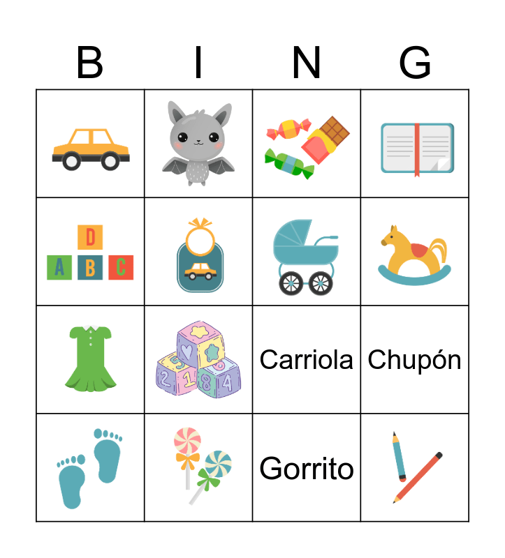 This bingo card has 35 images and 25 words: Pañal, Biberón, Chupón, Cuna, Carriola, Babero, Mantita, Gorrito, Calcetines, Sonajero, Leche, Fórmula, Toallitas, Crema, Bañera, Mordedera, Pijama, Body, Pañalera, Monitor, Juguete, Osito, Arrullo, Silla de bebé and Cochecito.