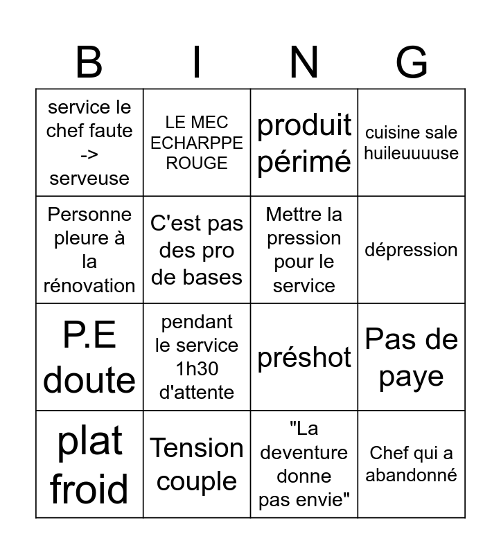 This bingo card has 16 words: Tension couple, Pas de paye, produit périmé, service le chef faute -> serveuse, P.E doute, LE MEC ECHARPPE ROUGE, préshot, "La deventure donne pas envie", Personne pleure à la rénovation, C'est pas des pro de bases, plat froid, cuisine sale huileuuuuse, pendant le service 1h30 d'attente, dépression, Mettre la pression pour le service and Chef qui a abandonné.